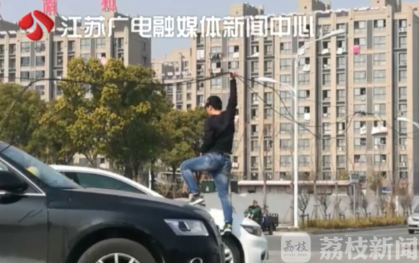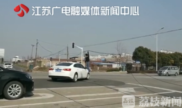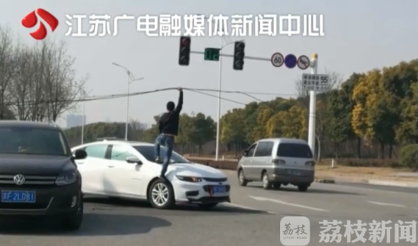 小许一只脚踩在车轮上,一只脚踏在前引擎盖上,单手托举,将电缆线举到两米高以上,让其余车辆顺畅通过。有车主拍下了这感人一幕,也有车主报了警。