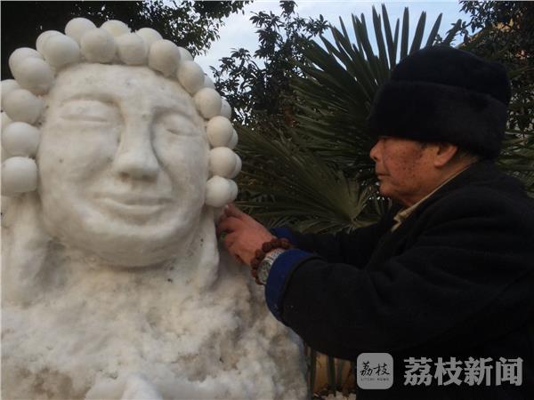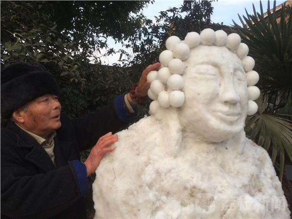 据了解,老汉叫刘启龙 ,今年78岁,家就坐在南京马道街161号附近。一个星期前就堆成了,由于风吹日晒,加上小朋友调皮损坏,老人每天都要修补维护一下。虽然不像绘画大师那样出彩,但画中人物线条毕现,特点突出,能明显感觉到绘画者平时观察入微。刘启龙讲,能够保留这么多天,多愧一位朋友帮忙。尤其是头上球球,刘启龙老先生用模具一个一个扣出来,然后再安在头上。笔者掏出钢卷尺,量了一下,约2米高,雪人双手合十。