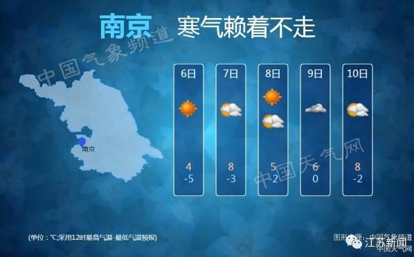 最低温度: 沿江和苏南地区-3℃左右,其它地区-5~-6℃,沿江以北地区有冰冻