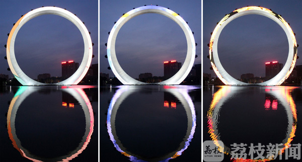 3月17日晚,位于常州市紫荆公园的“时来运转”无辐式摩天轮外圈通过灯光组合,不时变幻彩虹、腾龙和花环等光彩造型,如梦如幻的“灯光秀”点亮了夜空。