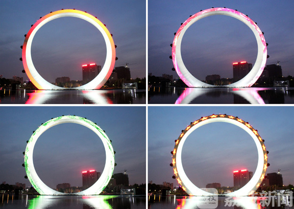 该摩天轮高89米,是常州市区地标建筑,因外观状如指环,被网民戏称为“指环王”,号称为“世界最大、国内唯一”的无辐式摩天轮。