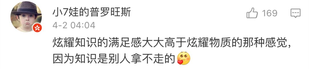 一位网友说,炫耀知识的满足感大大高于炫耀物质的感觉,因为知识是别人拿不走的。