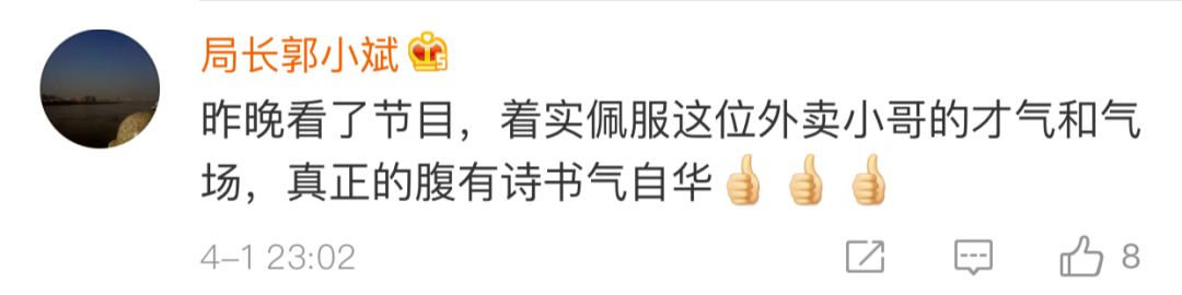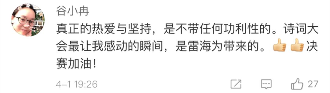 “将来的生活没想太多,想做好自己。不过大概不能专心送外卖了,我要做好准备,万一有顾客喜欢诗词大会,点了我送的外卖后,要跟我聊两句呢?”雷海为认真地说。