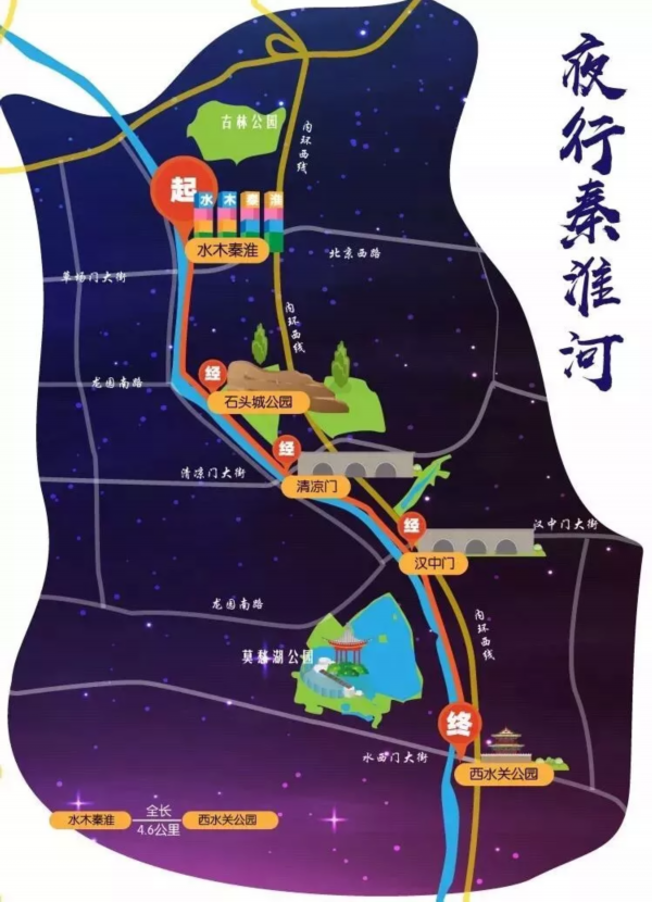 网友们从鼓楼区水木秦淮出发,沿秦淮河边上,途径石头城公园、清凉门大桥、汉中门大桥,到达终点站西水关公园,全程4.6公里。