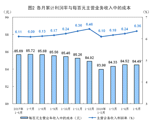 1-5月份,规模以上工业企业实现主营业务收入42.9万亿元,同比增长10.2%;发生主营业务成本36.3万亿元,增长9.8%;主营业务收入利润率为6.36%,同比提高0.35个百分点。