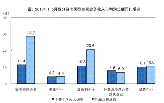 1-5月份,规模以上工业企业中,国有控股企业实现利润总额8103.5亿元,同比增长28.7%;集体企业实现利润总额93.1亿元,增长4.4%;股份制企业实现利润总额19119.8亿元,增长20.6%;外商及港澳台商投资企业实现利润总额6739.1亿元,增长6.9%;私营企业实现利润总额7466.2亿元,增长10.6%。