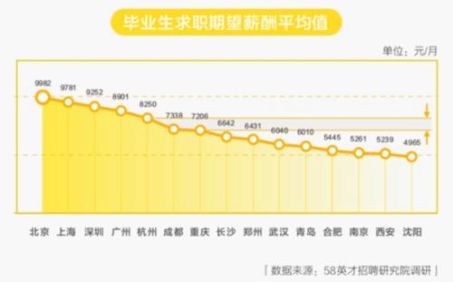 另外,因一线城市生活成本和薪资水平高,毕业生期望薪酬也相对较高。北京求职的毕业生期望薪酬排名第一,达到9982元/月。
