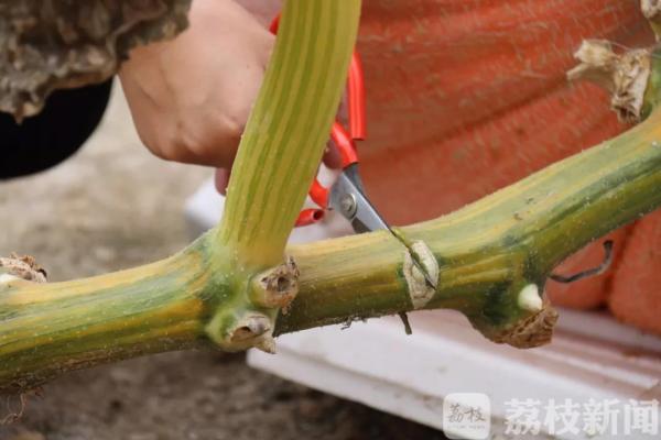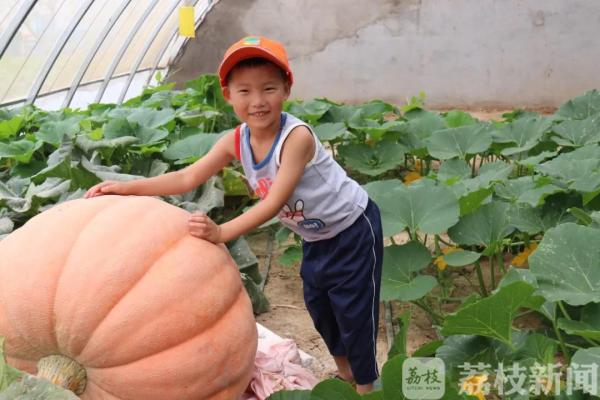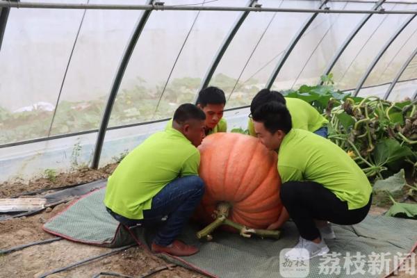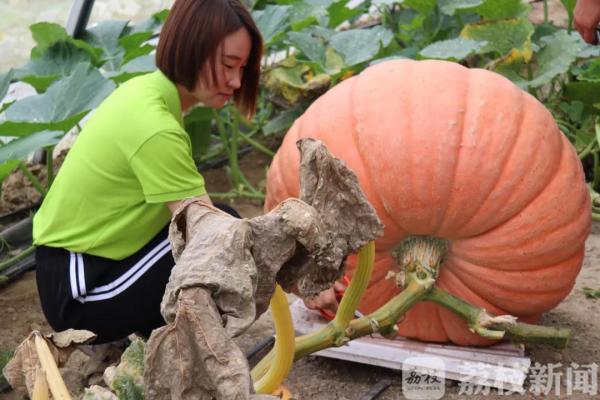 荔枝新闻讯 今天(6月30日)上午, 在宿迁洋河嘉年华的日光温室基地里,不时就传来一阵惊呼声。四五个巨大的南瓜正躺在瓜地里,橘色的外表十分显眼,两个人合抱才能抱过来。再瞧瞧它的叶子和瓜藤,也比寻常的南瓜大上许多。摸一摸,拍好照,工作人员就挑选其中的一个开工了。剪刀使劲剪了几下,瓜茎才断开。