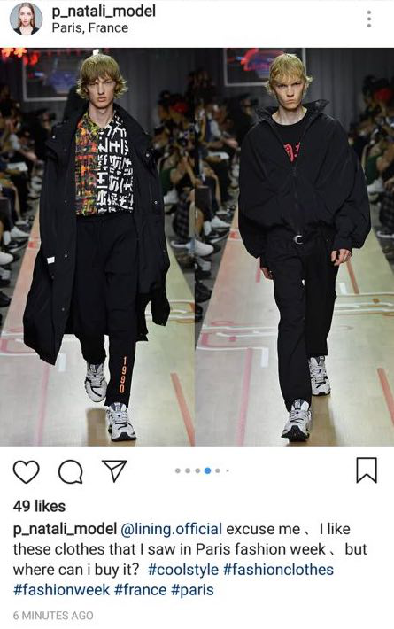 有趣的是,李宁的T 台同款不仅通过天猫在国内掀起了抢购热潮,在全球最大的图片社交应用 Instagram 上,李宁的巴黎男装周T 台同款也让全球网友都看得心痒痒的。
