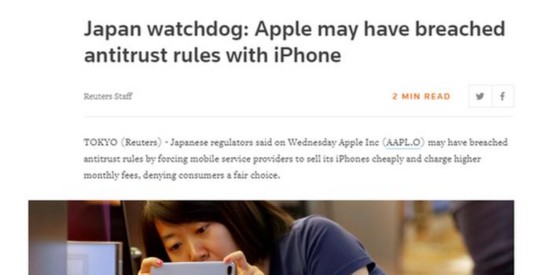 新浪美股讯 北京时间7月12日消息,据路透社报道,日本监管机构周三表示,苹果公司可能违反了反垄断规定,迫使移动运营商廉价出售iPhone,并收取更高的月租,从而剥夺了消费者的公平选择。