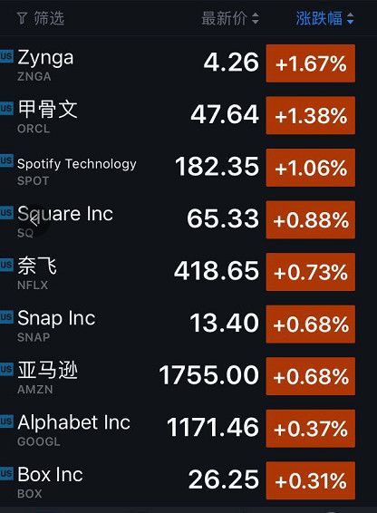 另一方面,涨幅较大的公司则包括:Zynga(涨1.67%)、甲骨文(涨1.38%)和Spotify(涨1.06%)。