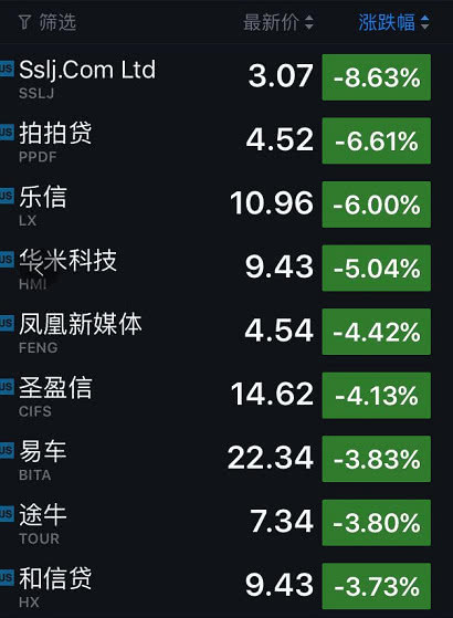 中国概念股多数下跌,其中跌幅较大的公司包括:盛世乐居(跌8.63%)、拍拍贷(跌6.61%)、乐信(跌6.00%)、华米科技(跌5.04%)、凤凰新媒体(跌4.42%)、圣盈信(跌4.13%)、易车(跌3.83%)、途牛(跌3.80%)、和信贷(跌3.73%)、哔哩哔哩(跌3.62%)、格林酒店(跌3.31%)、唯品会(跌3.18%)、尚德机构(跌3.15%)、瑞思教育(跌2.82%)、百世集团(跌2.70%)、阿里巴巴(跌2.66%)、陌陌(跌2.65%)、朴新教育(跌2.51%)、信而富(跌2.39%)、中通快递(跌1.96%)、搜狗(跌1.89%)、微博(跌1.84%)、聚美优品(跌1.74%)、畅游(跌1.74%)、京东(跌1.66%)、研控科技(跌1.36%)、新浪(跌1.31%)、搜狐(跌1.28%)、58同城(跌1.16%)、中芯国际(跌1.16%)和精锐教育(跌1.04%)。