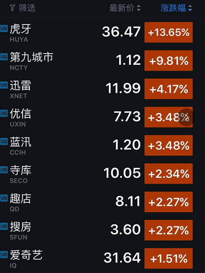 另一方面,涨幅较大的公司则包括:虎牙(涨13.65%)、第九城市(涨9.81%)、迅雷(涨4.17%)、优信(涨3.48%)、蓝汛(涨3.48%)、寺库(涨2.34%)、趣店(涨2.27%)、搜房(涨2.27%)、爱奇艺(涨1.51%)、猎豹移动(涨1.25%)和宜人贷(涨1.20%)。