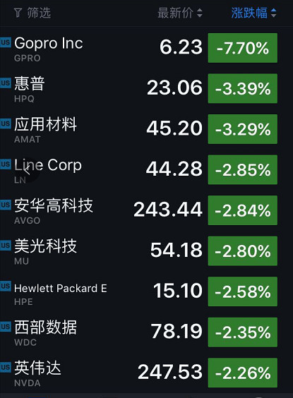 美国科技股也多数下跌,其中跌幅较大的公司包括:GoPro(跌7.70%)、惠普(跌3.39%)、应用材料(跌3.29%)、Line(跌2.85%)、博通(跌2.84%)、美光科技(跌2.80%)、惠普企业(跌2.58%)、西部数据(跌2.35%)、英伟达(跌2.26%)、Zuora(跌2.10%)、黑莓(跌1.98%)、英特尔(跌1.84%)、高通(跌1.83%)、AMD(跌1.69%)、苹果(跌1.30%)、VMware(跌1.23%)、Dropbox(跌1.09%)和特斯拉(跌1.09%)。