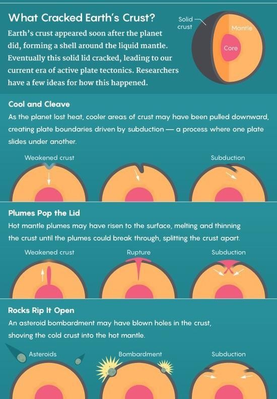 一些研究人员认为侵入作用引起了这种变化。在过去的两年里,有多组研究人员提出,太阳系诞生时遗留下来的小行星可能对地球的大盖子产生撞击。去年秋天,奥尼尔和同事发表的研究表明,地球形成5亿年后,一群高速飞行小行星穿透地球上寒冷的地球到达了高温的上地幔。2016年,丸山茂德和同事认为,带有强大冲击能量的小行星会带来水分、削弱岩石,使得板块运动得以启动。