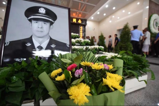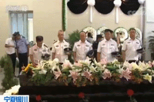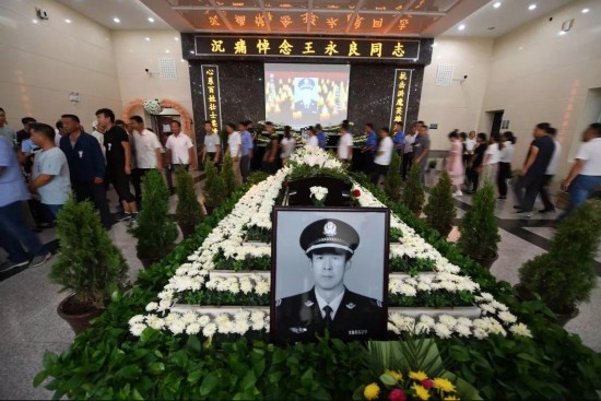 7月28日上午,天幕低垂,银川市殡仪馆门口,摆满了花圈,“为民献身浩气长存,无私奉献英灵永在” ……一条条黑色的挽联寄托着人们对英雄的无尽哀思。800余名民警与自发前来的民众共1600多人参加王永良追悼会,共同送英雄最后一程。
