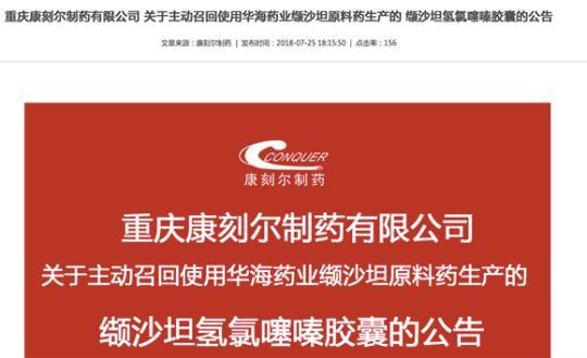 华龙网记者获悉,目前,重庆康刻尔制药有限公司已在官网发布了公告,宣布召回使用华海药业缬沙坦原料药生产的缬沙坦氢氯噻嗪胶囊。