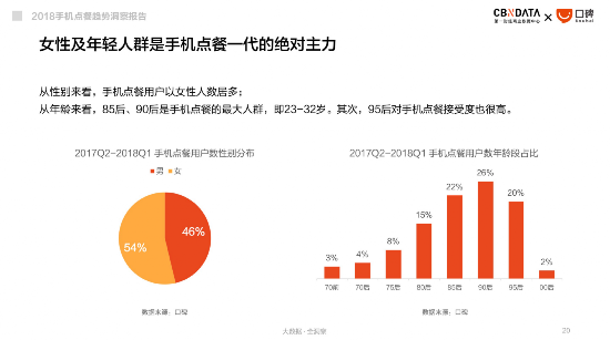 报告同时也洞察了引领手机点餐新姿势的人群特征。80后、90后作为消费升级的中坚力量,不出意外地成为手机点餐新一代。口碑数据显示,80后、90后(即18-37岁)占到了手机点餐总人数的83%。在人群渗透率方面,这一人群的手机点餐渗透率也远远领先于其他年龄段人群。