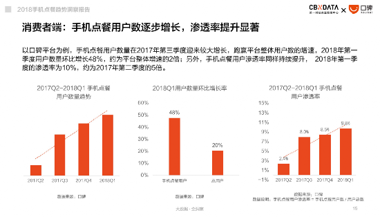 越来越多的商家接入手机点餐,对应的也有越来越多的消费者使用手机点餐。过去一年称得上是手机点餐的规模发展起步年。根据口碑平台数据,不到一年时间内,全国手机点餐用户的渗透率从去年二季度的2.4%,增长到了今年一季度的近10%。这意味着手机点餐新体验带来的便利性,正被越来越多的消费者接受和认可。