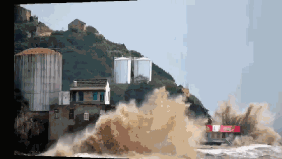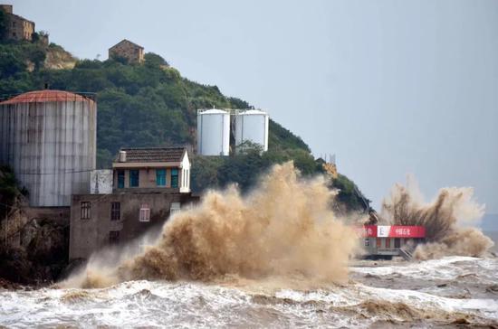 7月21日下午,台州温岭石塘镇金沙滩,浪打几米高,直漫堤坝。