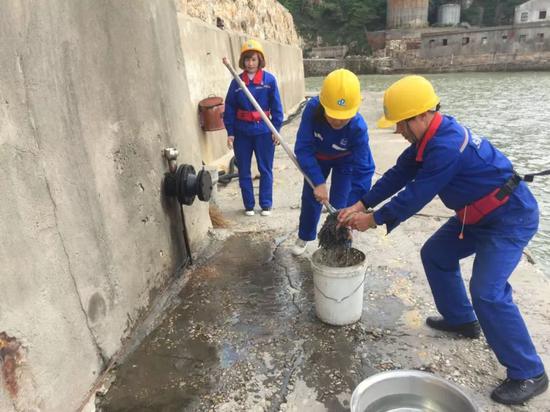 每次台风来,潮水都会把整个五岙站覆盖掉,为了不被潮水冲垮,五岙站建设的时候特意设计了离地1米四高的悬空建造法,以便潮水穿过,而且油站的码头也加装了防浪板等设施。但每次台风过后,潮水倒灌油站,房间里会有三四厘米厚的淤泥,员工们都加班加点进行灾后抢修。