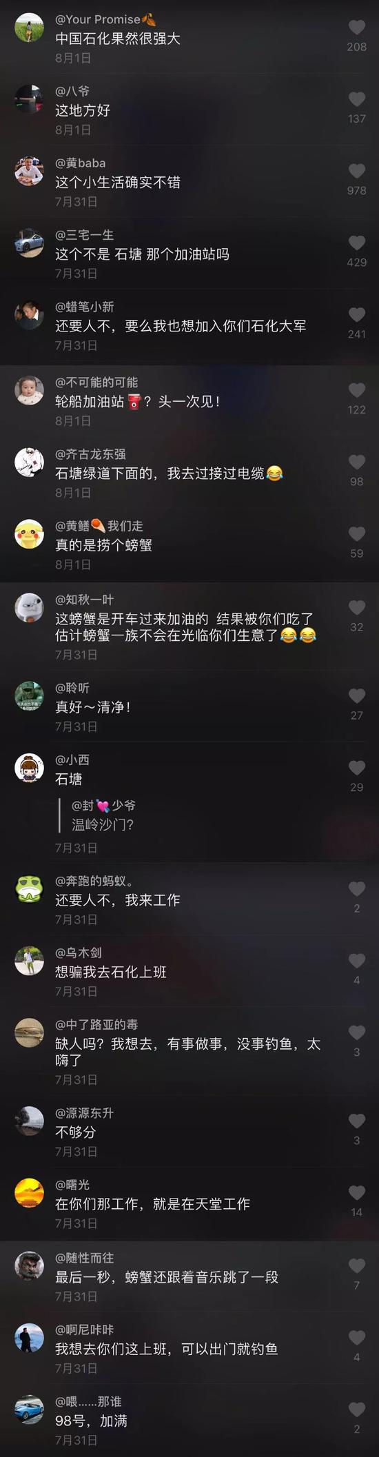加油站养了两条狗:“大黄”和“肉球”,员工巡查时,狗上蹿下跳紧跟着。他们下班,狗还会送他们一段路。加油站里的日子欢乐融洽,有时候往海里扔几个蟹笼,以小鱼当饵,总能捞上几只蟹,煮了一起吃。女员工余正君说,每天面朝大海,心胸宽阔,心情愉快。