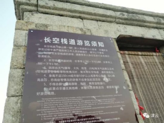 对于长空栈道这一惊险刺激的游乐项目,入口处张贴着醒目的游览须知,其中提醒身高不够、年龄过大或患有恐高症、高血压等病症的游客不应参加此项目。