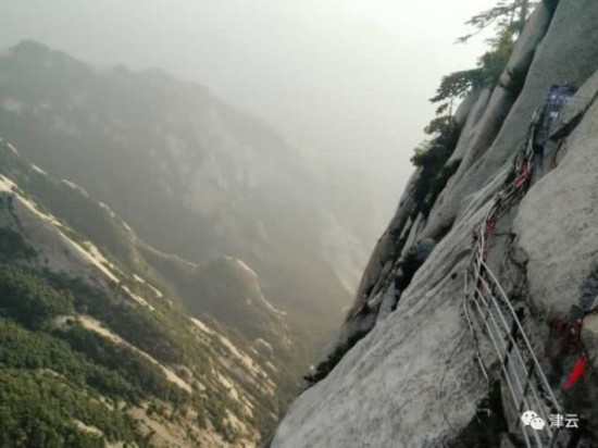 长空栈道位于南峰绝壁之上,被称为华山天险之首。此处海拔约2070米,和华山最高峰南峰的2154.9米海拔相差还不到100米,站在栈道入口处一侧的小平台上,旁边即是垂直陡削的悬崖峭壁,用万丈深渊形容也不为过,连素来不恐高的记者往下望去也不禁双腿发软。