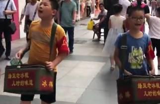 16日,湖北武汉,一对表兄弟在街头卖冰棍,一天可收入100元钱。其中一名男孩说,要将赚的钱给妈妈用来买面膜,因为她雀斑太多。