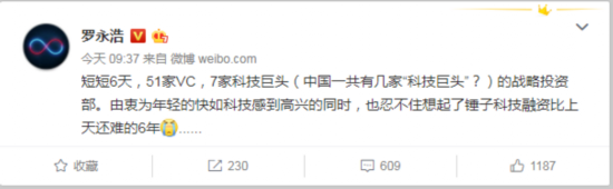 罗永浩还感叹道:“忍不住想起了锤子科技融资比上天还难的6年。”
