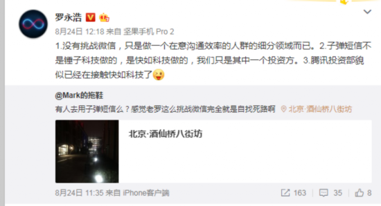 针对上述类似言论,罗永浩在微博表示,“1、没有挑战微信,只是做一个在意沟通效率的人群的细分领域而已。2、子弹短信不是锤子科技做的,是快如科技做的,我们只是其中一个投资方。3、腾讯投资部貌似已经在接触快如科技了。”