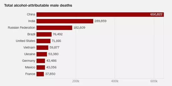 而在酒精致死人数的统计中,中国的人均饮酒量虽然不突出,但由于人口基数,中国因酒精导致死亡的人数位列全球榜首。仅2016年,中国就有超过70万人的死亡与酒精直接相关,远高于排名二、三的印度(33万)和俄罗斯(22万)。