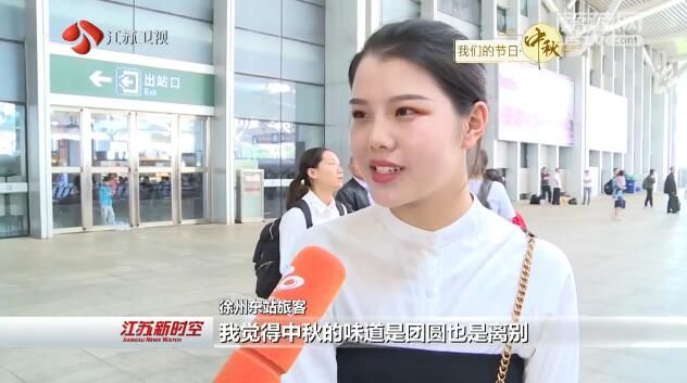 徐州东站旅客:“我觉得中秋的味道是团圆也是离别,因为我现在匆匆忙忙地赶回家,明天又要匆匆忙忙地赶回来了,挺不舍的。”