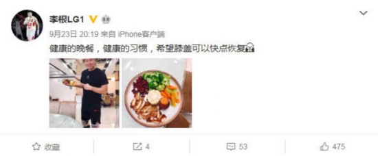 男篮蓝队的李根可就没有那么幸运了,上赛季联赛结束之后,他就一直处于养伤的状态,不但缺席了蓝队所有的热身赛和世预赛,连澳门“非凡12”的邀请赛都没有参赛。李根在个人社交平台上写道:“健康的晚餐,健康的习惯,希望膝盖可以快点恢复!”从李根上传的图片可以看到,他的膝盖上还被包裹着,另外他拿着的食物也没有高脂肪,所以李根仍处于伤势的恢复阶段。