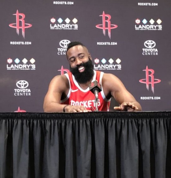 腾讯体育讯 北京时间9月25日,火箭队的新赛季媒体日,詹姆斯-哈登接受了媒体采访。