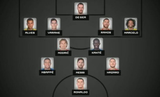 腾讯体育讯 北京时间9月25日凌晨,国际足联年度最佳球员颁奖典礼在英国伦敦举行,目前FIFA年度最佳11人阵容的评选结果已经揭晓,前锋线为梅西、姆巴佩、C罗;中场组合为莫德里奇、坎特、阿扎尔;后防线为:阿尔维斯、瓦拉内、拉莫斯、马塞洛;门将为:德赫亚。在FIFA年度最佳阵容中,2017-18赛季效力于皇家马德里的球员有5名,而世界杯冠军法国队则有3名球员入选。