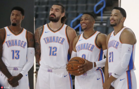 媒体日的日常就是采访和拍照。雷霆的这些球员们却能将拍照的部分变得趣味无比。韦少、罗伯森、亚当斯和泡椒在拍照的时候,一会儿偷偷扯一下别人衣角,一会儿拍拍另一个人的胸脯,把摄影师逗得都要停下来笑一会儿再继续拍。在单独拍泡椒和罗伯森的时候,韦少在一旁突然摆了一个“半蹲抱水缸”的姿势,逗得大家哄堂大笑,然后他自己调皮的跑开了。