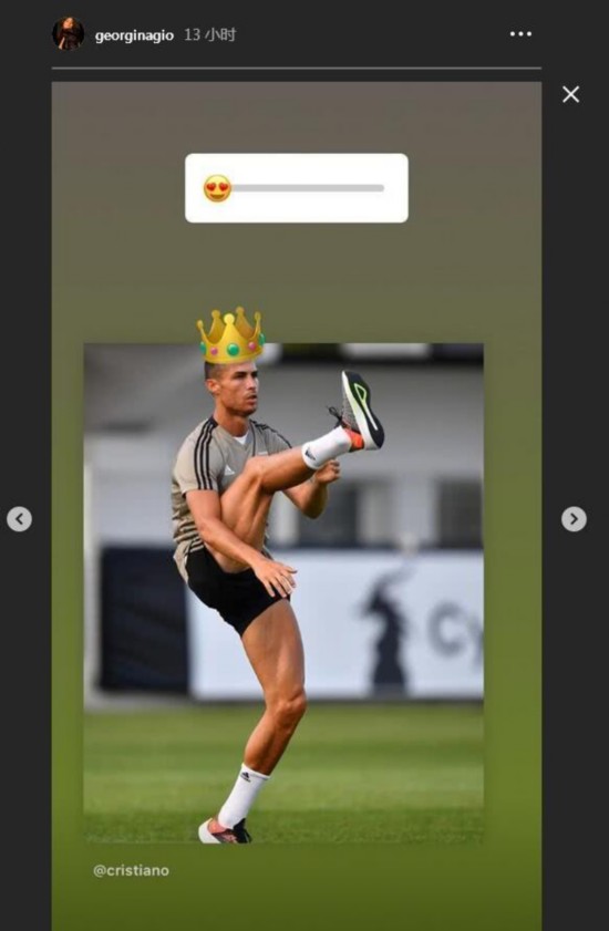 很显然,作为总裁的女友,乔治娜-罗德里格斯现在最了解C罗的心情,为此,她贴心地在ins贴上一张C罗训练的照片,还在上面PS了一个王冠,暗示今年带领皇马夺得欧冠三连霸、并夺得欧冠金靴的C罗乃无冕之王,还在上面加上一个爱慕的表情,力挺自己的男人。
