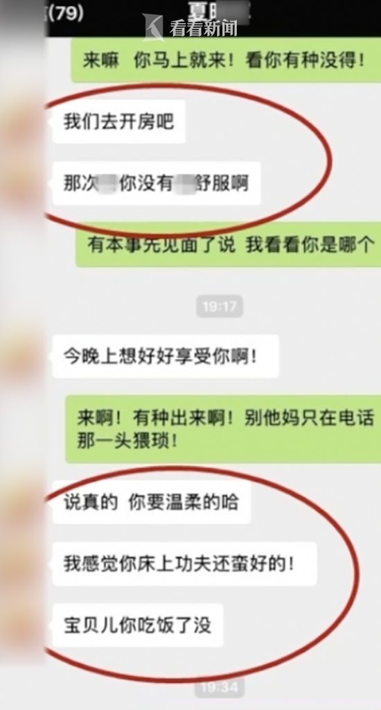 从小李出示的聊天截图上可以看到,夏先生开始只是向小李表达“想你”等关心,在小李接连回复“不认识你”,甚至开口骂人之后,夏先生便开始接连给小李发了一些不可名状的图片,并表示要跟小李开房发生关系,还询问一晚上多少钱。已经结婚的小李,头一次遇到这种骚扰,非常愤怒。
