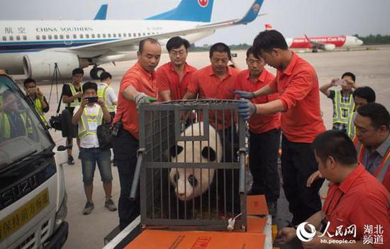 有些读者可能会关心,真正的大熊猫“坐飞机”又是什么样的呢?专业人士表示,运输熊猫一般会根据飞行距离的长短,选择不同的方式。短途运输会让熊猫坐货仓中的有氧舱,不会使用专机;长途运输时,为保障运输安全和大熊猫的舒适度,则选择专机运输。记者查阅了相关报道,也找到了一个“熊猫‘伟伟’从武汉飞往四川”的案例。据悉,今年6月,熊猫“伟伟”需要乘坐南航航班从武汉动物园飞回四川休养。在乘机前,熊猫“伟伟”被放置在一个量身定做的笼子中,笼子尺寸刚好和飞机货舱舱门大小一致,并能保证熊猫能在笼子里自由转身(见下方图片)。然后,熊猫“伟伟”需要通过安检,乘坐一辆专用小拖车来到停机坪,并通过传送带进入飞机的恒温有氧货仓。而舱内也会一直保持20-25℃左右的温度,并由工作人员做好衔接和固定工作,让熊猫安然度过空中的飞行时间。