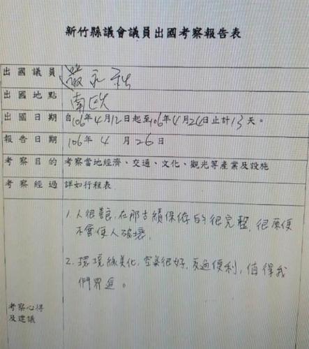 据《中时电子报》等台媒报道,新竹县议员严永秋去年4月曾赴南欧考察13天,返台后交出了一份只有短短两行、42字的“心得报告”。