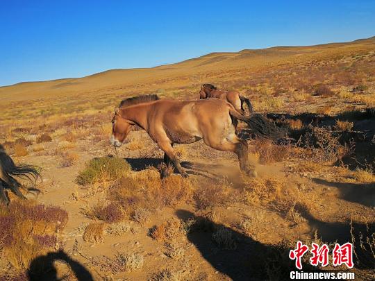拟野放的普氏野马撒欢的跑向野地。 张赫凡 摄