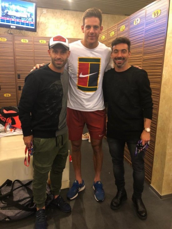 拉维奇和小马哥不仅在看台上看了比赛,还在赛后持VIP证件来到球员休息室,并与德尔波特罗合影。在身高1.98米的德尔波特罗身边,两位阿根廷国脚就像追星的小粉丝。马斯切拉诺立即在个人社交媒体上晒出了这张合影,并写道:“见到你很高兴。德尔波特罗”。