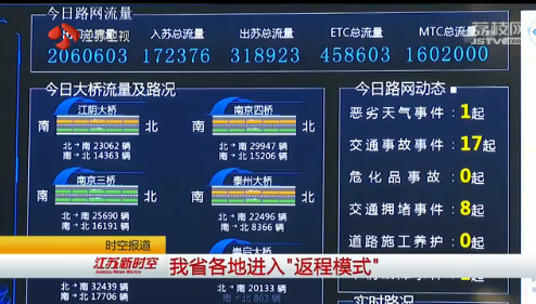 江苏台记者毛俊:这里是江苏省高速公路联网指挥中心,现在是下午的4点40左右,从今天中午开始,全省高速路网就迎来了一波返程客流高峰,那么此时此刻,沪宁高速的苏州、无锡段,京沪高速的广靖西澄段以及新扬高速的洪泽湖段都出现了车多缓行的情况,主要的车流方向都是由北往南,由西往东。