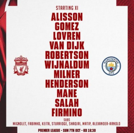 腾讯体育讯 北京时间10月7日晚23时30分,2018-19赛季英超第8轮一场焦点战,利物浦坐镇安菲尔德球场迎战曼城,双方出场阵容已经公布。