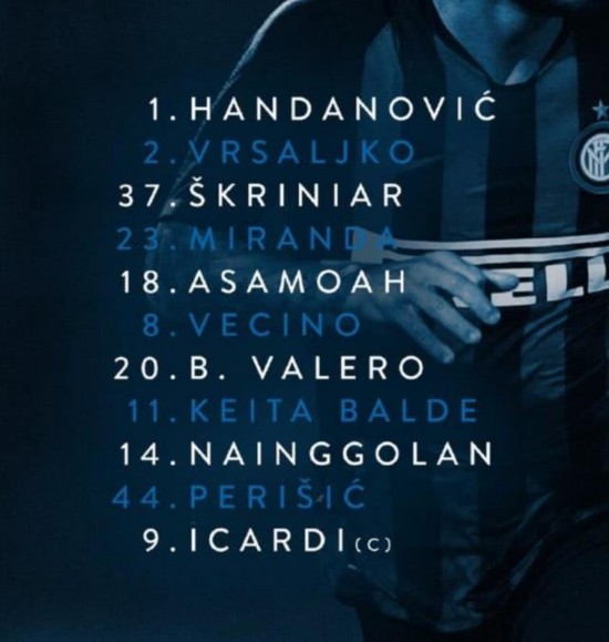 国际米兰(4-2-3-1):1-汉达诺维奇/2-弗尔萨里科、23-米兰达、37-什克里尼亚尔、18-阿萨莫阿/8-贝西诺、20-博尔哈-巴莱罗/11-凯塔-巴尔德、14-纳因戈兰、44-佩里西奇/9-伊卡尔迪