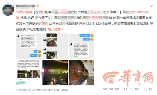 华商网讯 网友@iceland微博爆料称,10月5日下午8时左右自己和家人在翠花南路某知名网红串串店吃饭,吃到一半在锅底里捞出了五花肉,但是自己并没有点过五花肉,怀疑他们吃的锅底被“回了锅”!