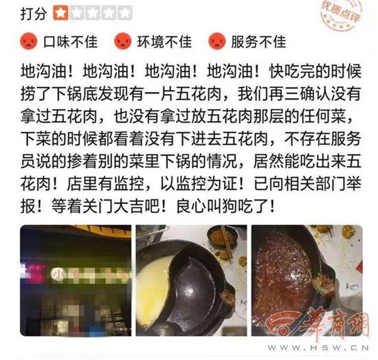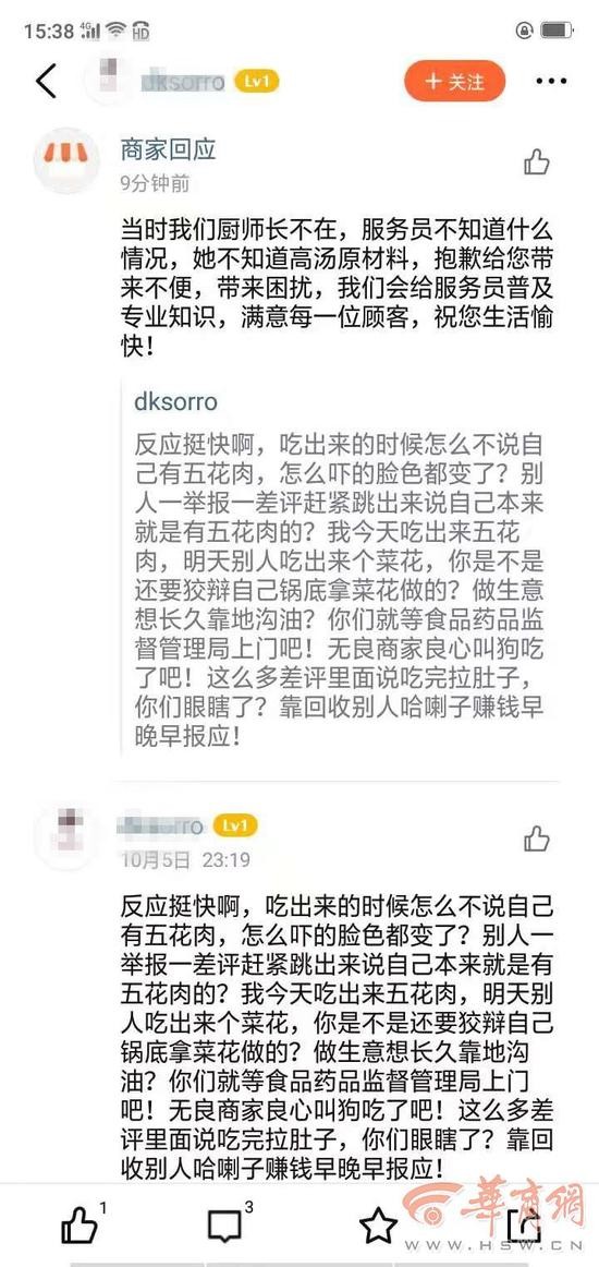 华商网联系到了网友@iceland询问了事件经过,该网友称,当时自己和家人在店里吃饭快结束时,竟然从锅里捞出了一片五花肉,捞出后立马询问家人是否拿菜时误拿了五花肉,家人确认没有拿,也没有拿过有可能混装五花肉的菜品。“我们家人都不吃肥肉,根本就没拿,而且菜都是一片一片分开下锅的,也不存在混装在盘底没看见、和其他菜一起下锅的可能性。我们希望调取监控来证明但被店家拒绝。”