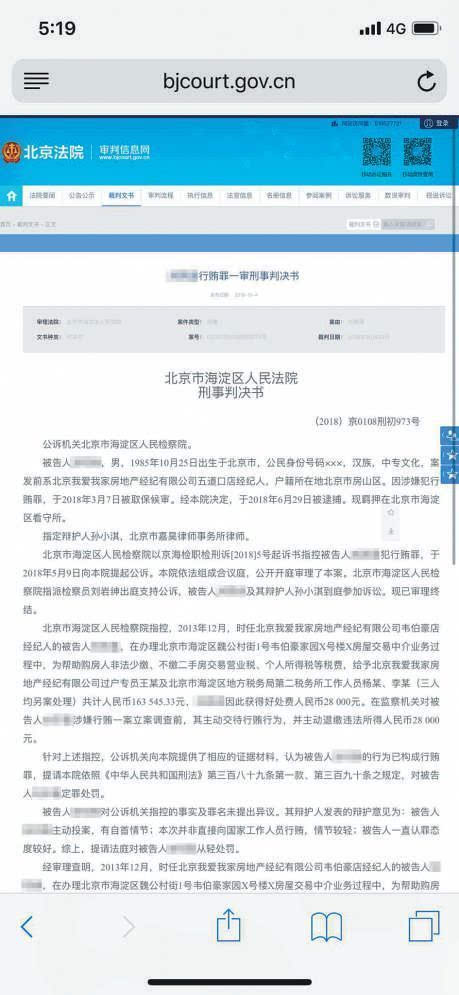 日前,北京我爱我家房地产经纪有限公司五道口店经纪人刘某因行贿罪,被法院判处有期徒刑8个月。此前,我爱我家房地产经纪有限公司过户专员王某因受贿罪已于今年5月终审被判处有期徒刑6年,海淀区地方税务局第二税务所工作人员杨某和李某,分别获刑18年和15年。