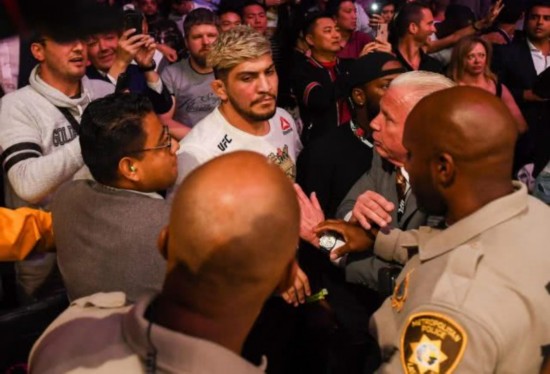 就在我们还沉浸在这场世纪之战的结尾喜悦当中时,小鹰冲出了八角笼,径直的扑向多次讥讽自己的嘴炮的陪练狄-丹尼斯。后者同样不甘示弱,这时八角笼附近的观众席上掀起了一阵暴乱。同时也有一些人跃进了笼子里,其中一个身穿红色上衣的男子直接朝着战败的嘴炮一顿狂打,这时情形进一步恶化,场上场下一片混乱。而这个偷袭了嘴炮的人已经被确定是羽量级中的潜力股祖巴拉-塔库哥夫。